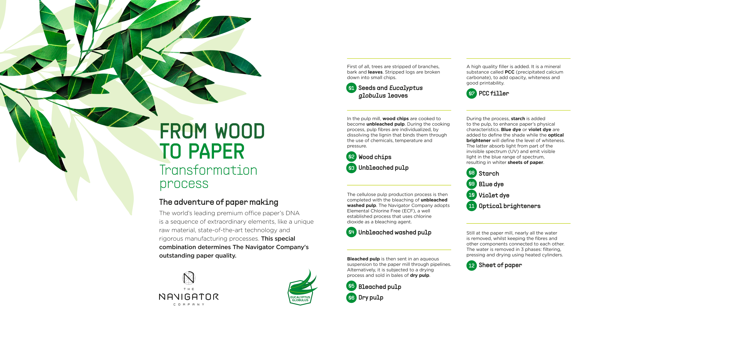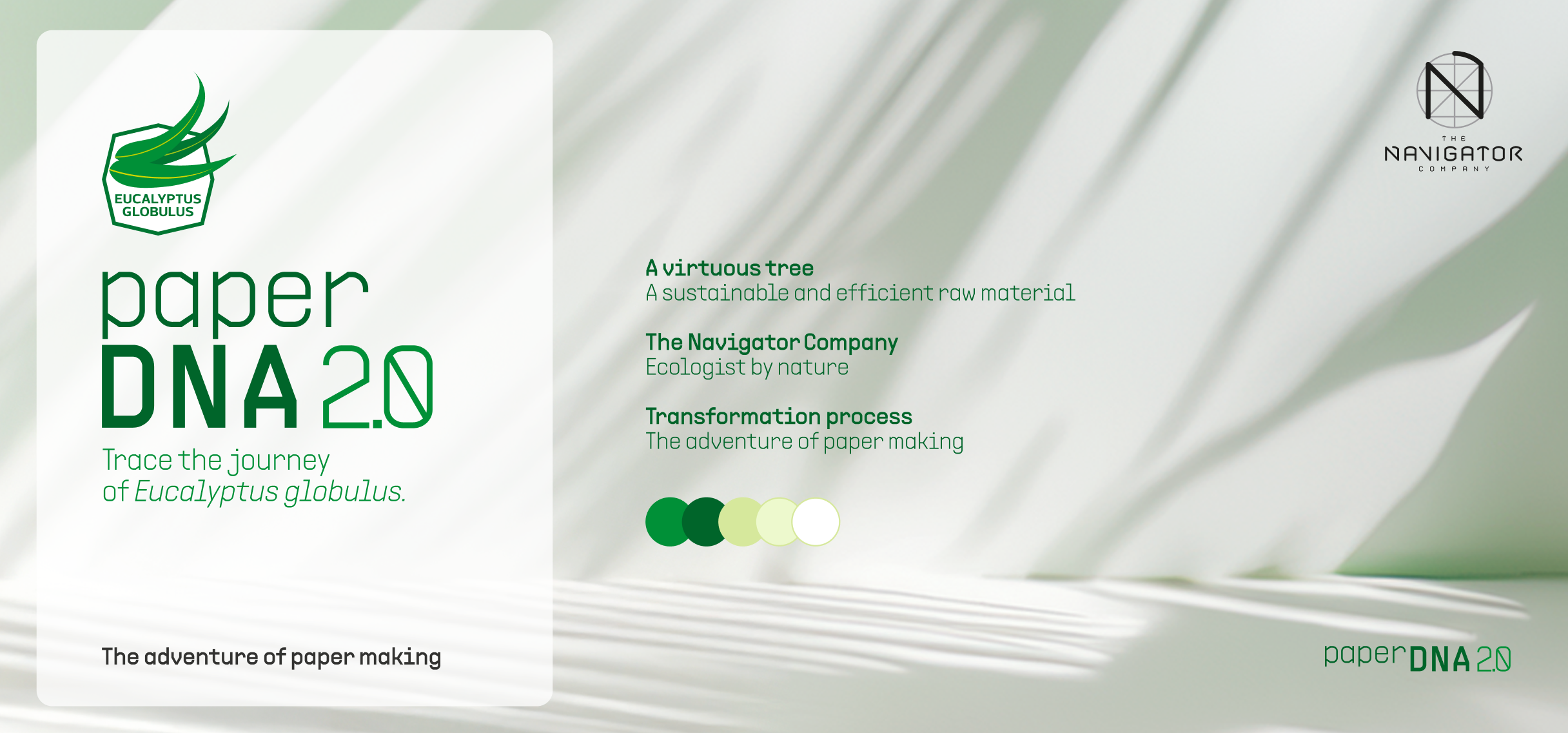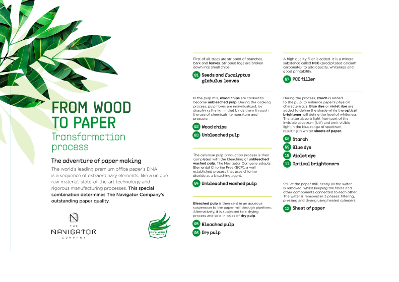 A The Navigator Company é um produtor integrado de floresta, pasta, papel, tissue, e muitas outras soluções sustentáveis de packaging e bioenergia. Assim, o desafio era criar uma peça que representasse o processo produtivo de uma folha de papel e sintetizasse as várias etapas do mesmo.