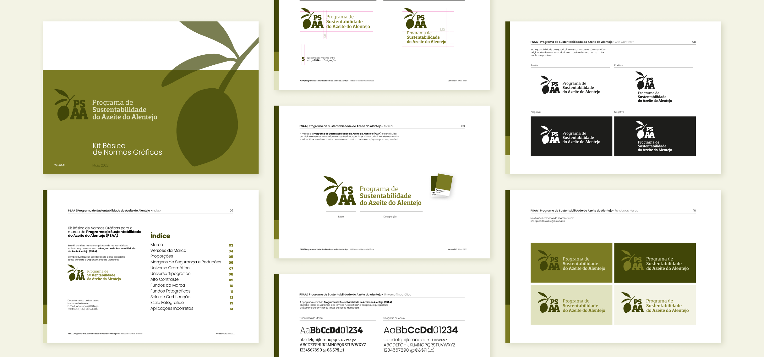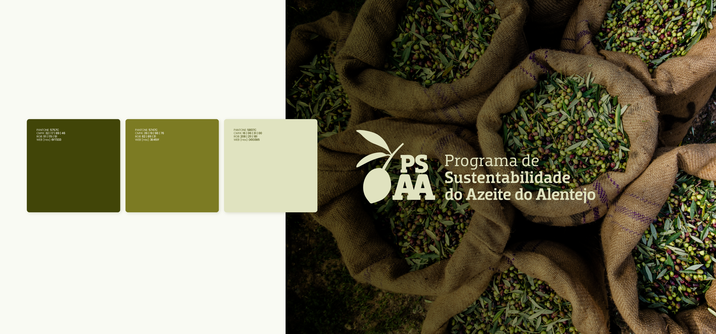 Tanto a homenagem à Azeitona como o destaque da sigla nos pareceram obrigatórios, já que se queria facilitar a leitura, referência verbal e identificação do Programa. O resultado é uma identidade harmoniosa, que concilia cores e elementos gráficos que remetem para o Olival com a solidez e credibilidade da fonte escolhida.