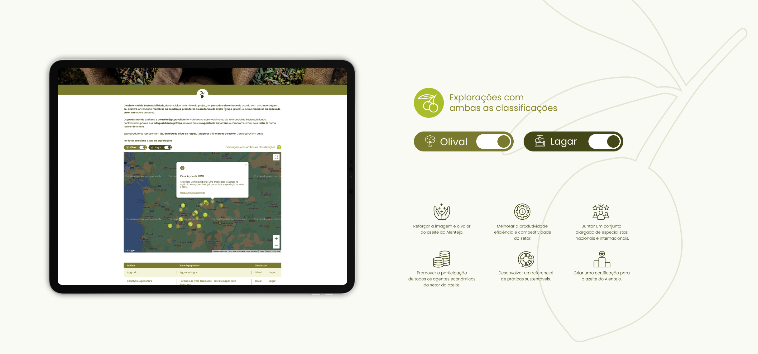 O website foi construído com base nas melhores práticas de UX/UI, com uma navegação simples e acessível, uma arquitetura de informação bem definida e uma paleta de cores relacionada com o setor olivícola.
